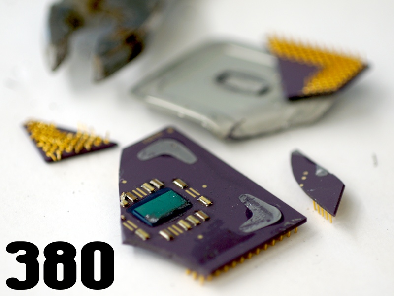 The above is a photo of what you see when you try to break open a modern processor chip and look inside. Doesn't really show you much, does it? That's because, as is normal, the chip is mounted upside down. What's inside is so complex that you wouldn't be able to figure out much from seeing it anyway. In fact, humans don't live long enough for any one person to understand every last detail of the literally billions of transistors that make-up a modern, high-end, processor. Don't worry. CPE380 (aka, CS380) will help you to understand how it all works in ways that will allow you to specify, design, and more effectively use these complex systems... without needing to know what each transistor does.