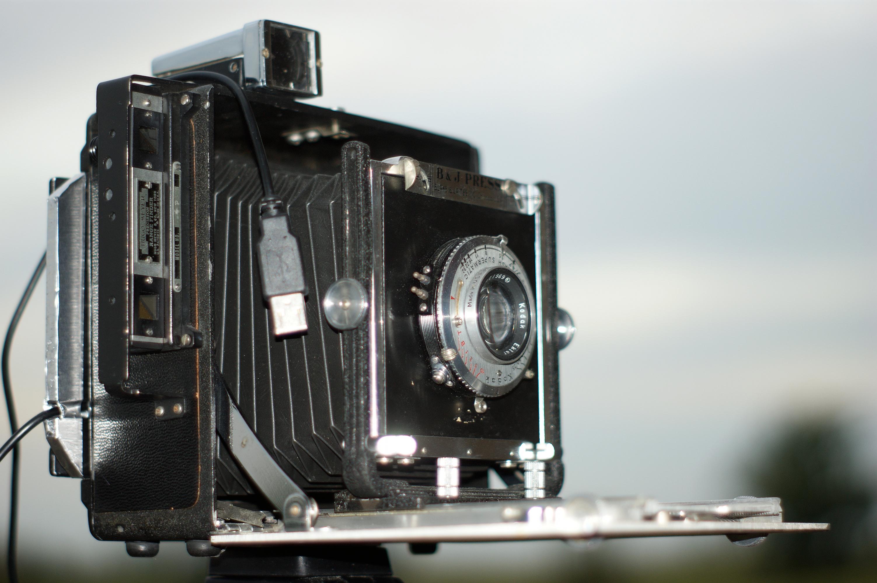 The photo at the top of this page is one of the more extreme examples of this principle. It's a relatively indestructable Burke & James Press View camera designed to take 4x5 sheet film... and yes, that's a USB cable hanging off the back. The other end of the cable is connected to this: