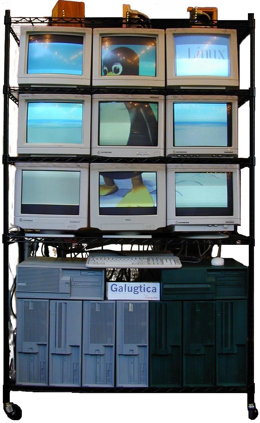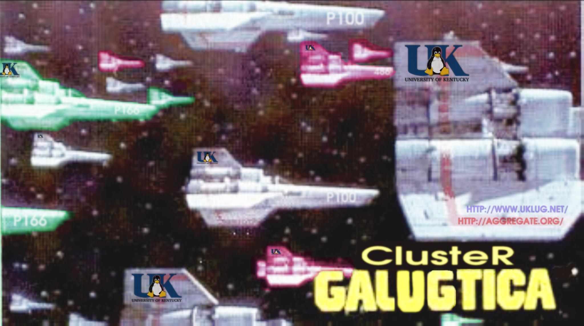 Galugtica has been constructed by the University of Kentucky Linux Users Group (UKLUG) as a demonstration and development cluster. Made of old PCs obtained from UK surplus for free (not unlike the Stone Soupercomputer), it is not very powerful... but it is a complete cluster configured with ethernet, PAPERS custom aggregate function network hardware, and even an array of monitors. Although there are over 30 machines dedicated to Galugtica, it is currently configured as a 9-PC computational video wall: