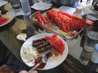 The presentation generally is very simple. Any Turkish meal always includes bread, the most typical would be something most like what is known in the US as a "French Loaf." A typical serving is about 5 Kofte served on a plate. On the side of the plate is a lump of dark red spices: essentially a spicy chili paste. In a separate serving dish shared by all is the Salata, a salad. The Salata served with Kofte always is dominated by slices or wedges of fresh tomato, often with some sliced cucumber and perhaps small slivers of fresh white onion and/or some hot peppers. There is no salad dressing per se, but salt and lemon juice, virgin olive oil, or vinegar often are sprinkled over the Salata. Sometimes, as in the above photo, the Kofte also is accompanied by white rice.