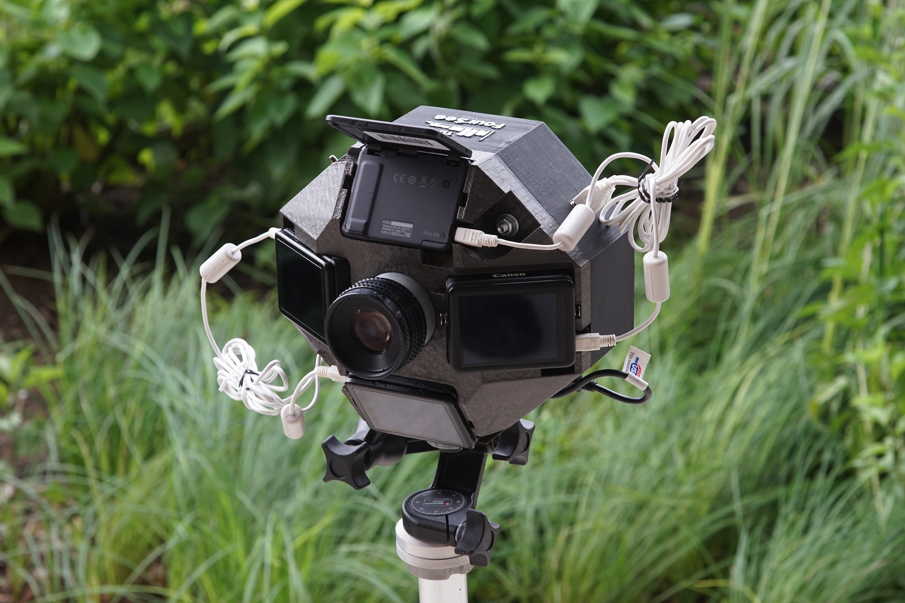 As part of our work in Time Domain Continuous Imaging (TDCI), we have created a new type of 3D-printed multi-camera in which multiple cameras photograph the image projected by a single lens. The single taking lens, here a Rodenstock Rogonar-S 135mm f/4.5 enlarger lens, defines the point of view for all the cameras so that there is no parallax error (there is a simple tilt to correct for each camera). The component cameras, four Canon PowerShot N, are each capable of up to 240FPS high-speed video; by coordinating them to capture with various framerates and exposure settings, a composite TDCI stream approximating 480FPS with high dynamic range can be captured. The coordination is implemented by custom code placed in the cameras using the Canon Hack Development Kit (CHDK). Shutter triggering is implemented by either the momentary or latching shutter button, which simply controls application of a 5V supply to the PowerShot N USB inputs to create a sync signal that is detected by the CHDK code.