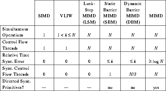 This research was the result of an effort to extend the PASM hardware to support a VLIW mode besides SIMD and MIMD modes. Although VLIW mode could not be supported on the PASM prototype, the PASM architecture was trivially modified to provide the support for barrier synchronization in MIMD mode. This formed the basis for defining new MIMD architectures, namely; Lock-Step MIMD (LSM), Static Barrier MIMD (SBM) and Dynamic Barrier MIMD (DBM). %These new architectures lie in-between SIMD, VLIW mode and the MIMD mode. The Table 1 from [dietz-6], reproduced here in Figure [BMIMDtable] provides a comparison of different modes.
