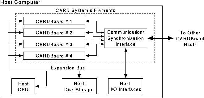CARD system was designed on the same principals as that of CARP Machine, therefore the basic element (computation node or CARDBoard) of CARD system was designed to provide much of the functionality of a CARP node using off-the-shelf microprocessors. To eliminate the design of I/O and data storage systems, it was decided to use a standard computer to house CARDBoards (Computation Nodes). In this way, CARD system uses the resources of host computer to simplify program development and debugging. The complexity of custom components is also reduced. In order to provide scalability, each host computer can house a communication interface which is used to connect compute nodes housed in different hosts. As more compute nodes means a larger number of host computers in a CARD system, data storage and I/O speed also scales with the system's computation power.