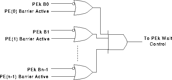 The static barrier mechanism presented in the thesis is the simplest of the barrier mechanisms, while the dynamic barrier mechanism is the most complex. The common element between the various barrier schemes is that they all use centralized barrier control logic, termed the barrier processor. The synchronization is not PE to PE, but rather PE to barrier processor. The barrier processor is responsible for tracking which processing elements participate in each barrier synchronization.