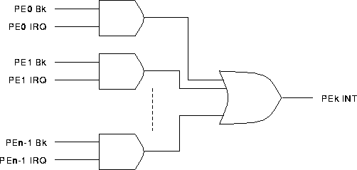 In a simple implementation, the interrupt mechanism can be an OR of interrupt request signals from all the PEs. An interrupt signal from one PE is seen by all other PEs.