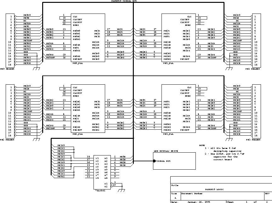 Inside the box, there is one 4" by 6" wire-wrapped card containing the PALs and LED driving circuitry and a 5 volt linear power supply (although a maximum of less than 1.5 amps is needed, we used a supply rated at 3 amps). Behind the circuit card on the back of the box are four panel-mounted Centronics connectors - so that the cables used to connect PEs to PAPERS0 are standard PC parallel printer cables. Ribbon cables connect the circuit board to the the centronics connectors. One end of each ribbon cable is crimped to the centronics connector while the other end is soldered to an 18 pin single-in-line (SIL) connecto on the circuit board.